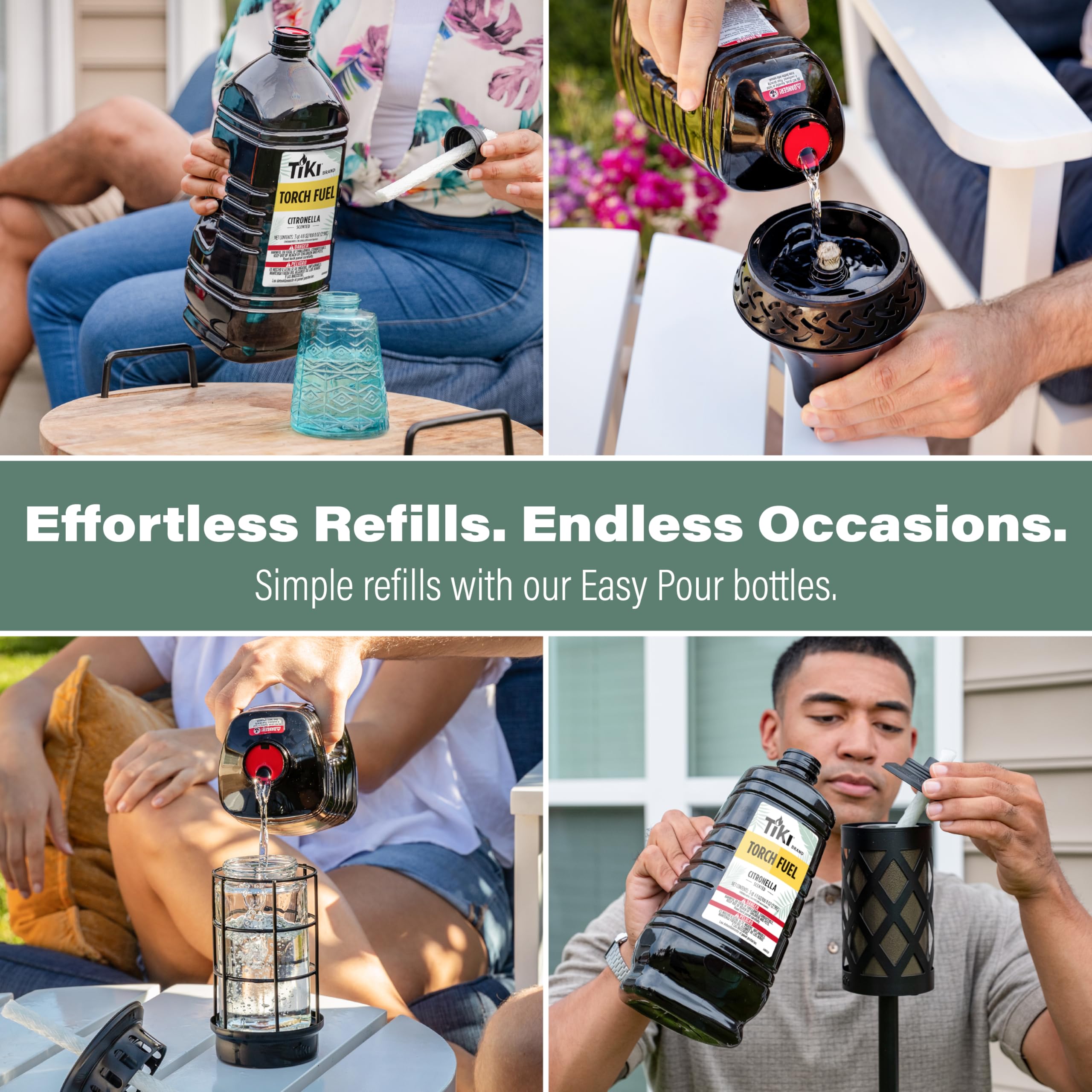 - CITRONELLA SCENTED TORCH FUEL: Infused with citronella and lemongrass oils, this premium torch fuel enhances your outdoor ambiance while keeping your torches burning bright. Now available in an Easy Pour Bottle for a mess-free fill.
